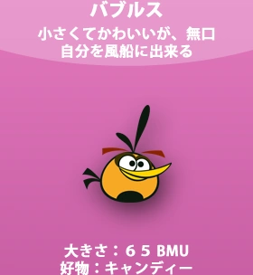 Bubbles,[3] originally known as the Globe Bird[note 1] or the Orange Bird,[9] is a character that appears in the Angry Birds series. He is a hatchling and occasionally a member of the Angry Birds, discovered by the Blues during Halloween. Bubbles is usually uninvolved in the conflict between the birds and the pigs, instead spending his time looking for candies. In older media, Bubbles only spoke in chirps and required Stella to interpret what he says, although he learned to speak more words as he grew older.