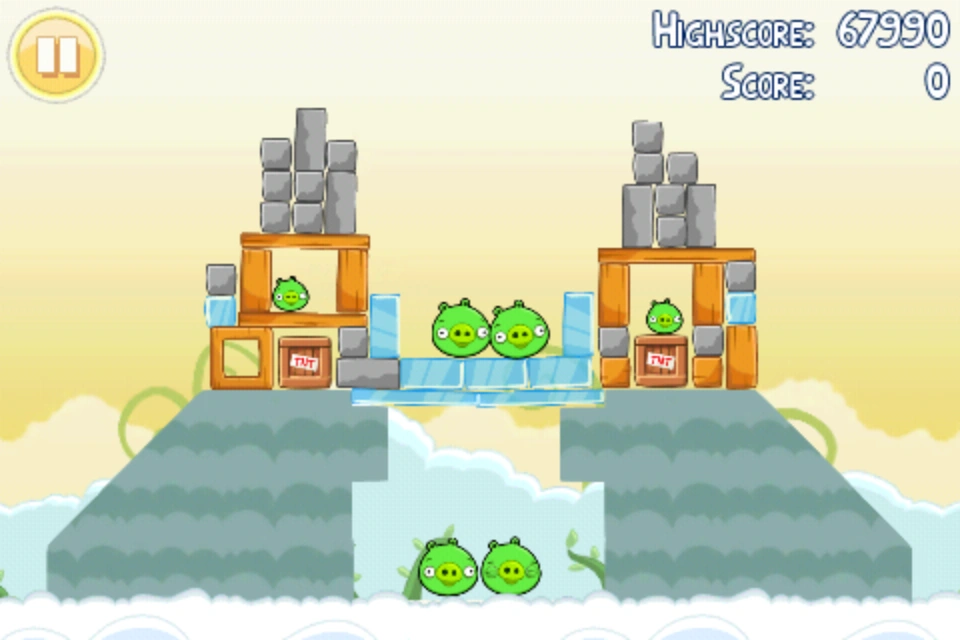 Fire the first Red into the middle stone atop of the left structure. Sling correctly because the result relies mostly on the first shot. The stone blocks will fall to the right and break the glass bridge. The entire left structure will topple into the trough. Use the next Red or two to trigger the TNT in the right structure.