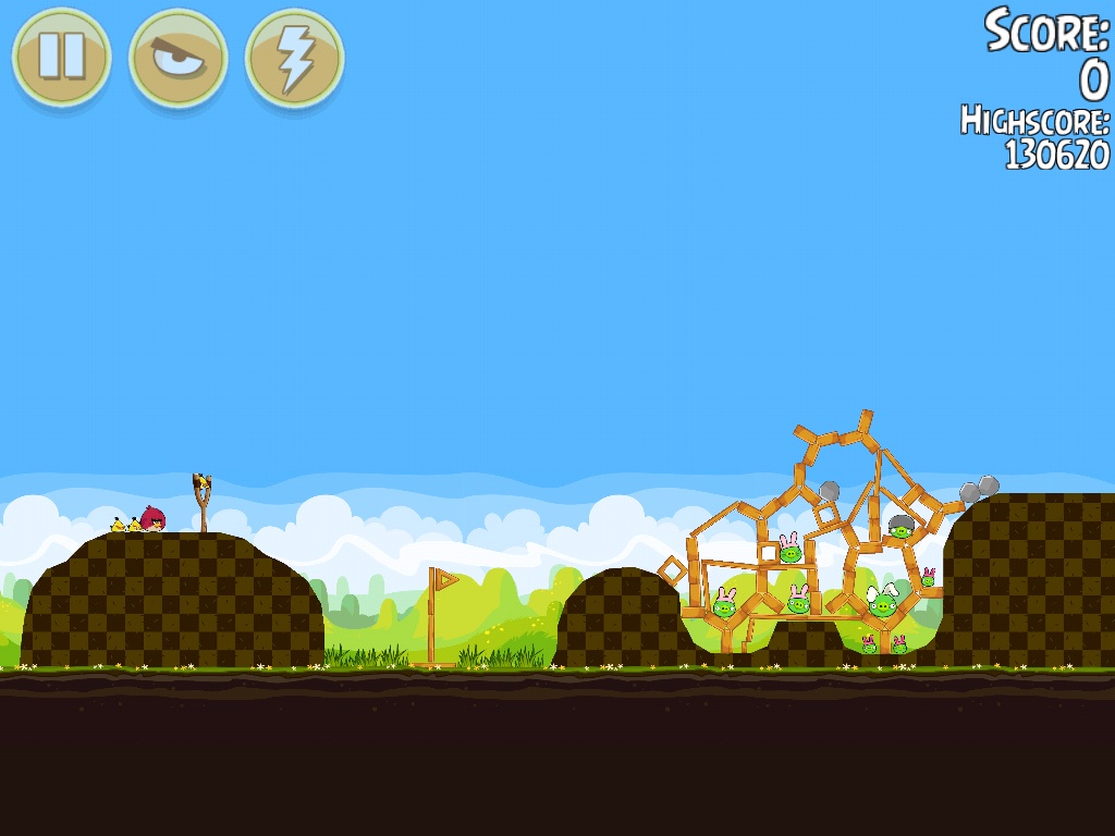 Launch Yellow Bird towards the thin wooden plank at the left side, then damaging the hollow wooden block. the launch Big Brother Bird at the same angle to destroy the left side. Then use the remaining birds for the right structure.