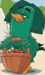 Eva is an anthropomorphic green bird with a short dark-green crest that resembles short hair in a bob cut hairstyle and an orange beak. She has three dark green feathers on her tail and has orange talons.