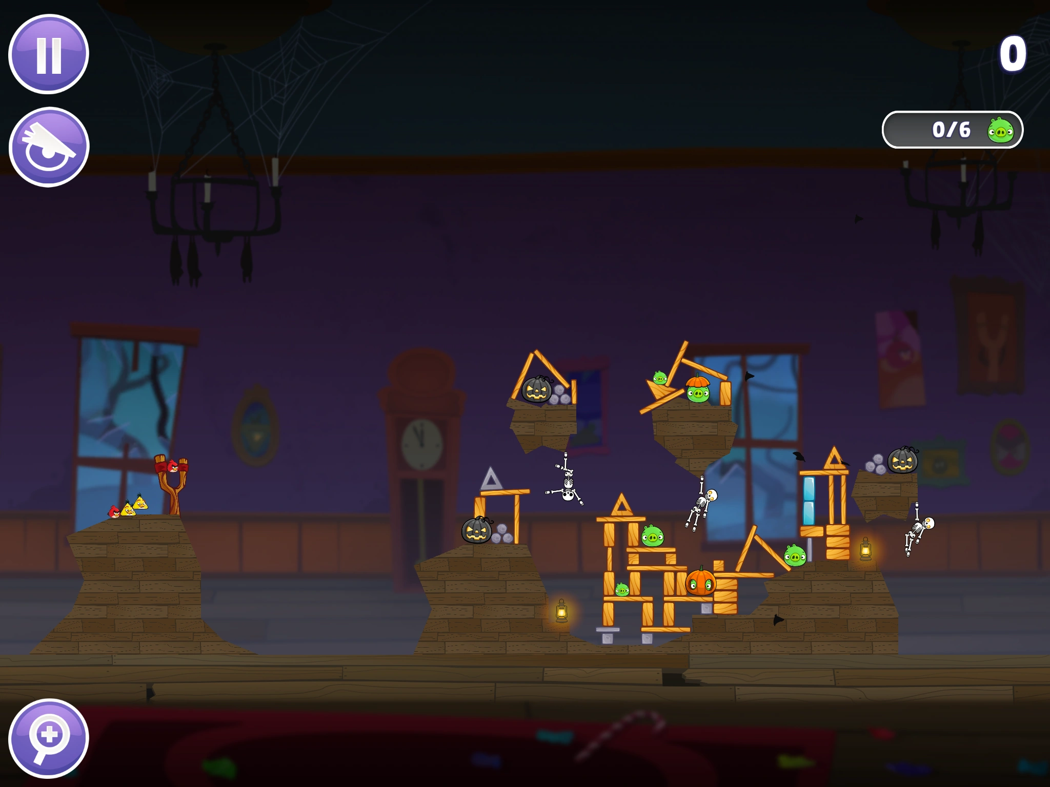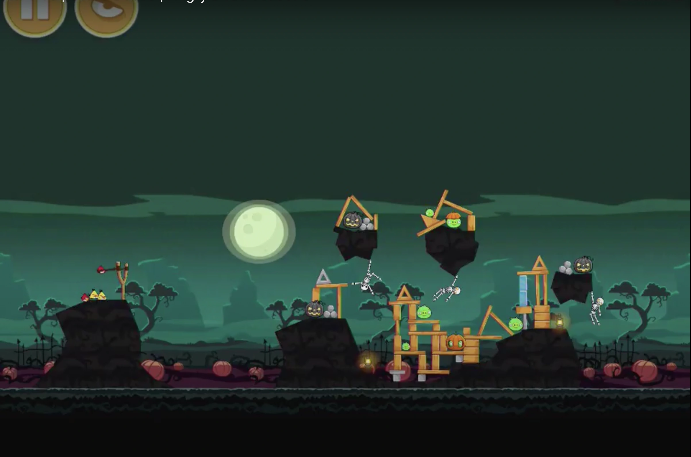 Launch Red to the middle black jack-o-lantern so he can blow it up and destroy part of the building. Then, Launch the 1st Chuck to the top black jack-o-lantern so he can blow it up and the tiny stone rocks should destroy a lot of the building. Finally, Launch the 2nd Chuck to the Large Pig that's in the pumpkin and you should get over 76,000 points.