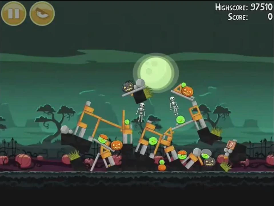 Fire the White Bird below the first explosive jack o' lantern. The resulting explosions from the egg bomb and the pumpkin should kill all but the central Large and Small pigs, and the Corporal Pig. Shoot the Orange Bird between the three to finish them. The unused Yellow Bird awards the player 10,000 extra points
