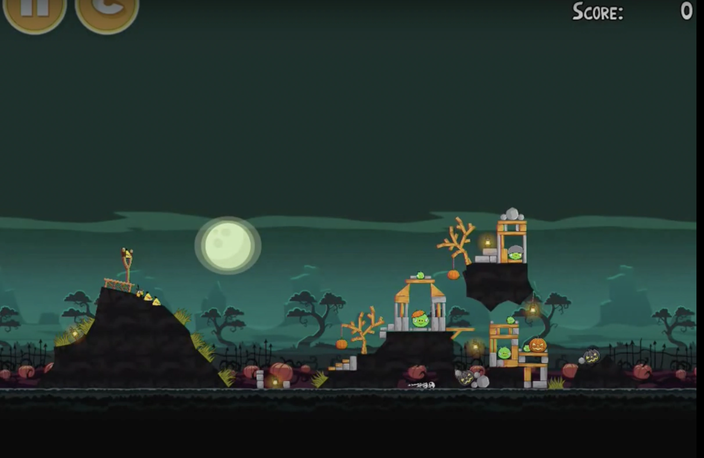 loft the Chuck into the top structure. Note that going through the tree will result in more points, but may not topple the structure. Bounce the Bubbles off of the top platform to land it in the center of the level. Its expansion should level both remaining structures. If necessary, use a Chuck to clean up and you should get over 78,000 points.