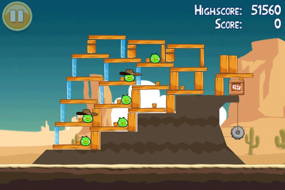 Fire Red through the first horizontal wooden plank, causing the first column to collapse. Next, fire Matilda head-on towards the structure, bombing as late as possible. Pop the last pig by taking out the third column with Chuck. If you're lucky, Chuck will cause the TNT to detonate via debris and you will earn a few extra thousand points.