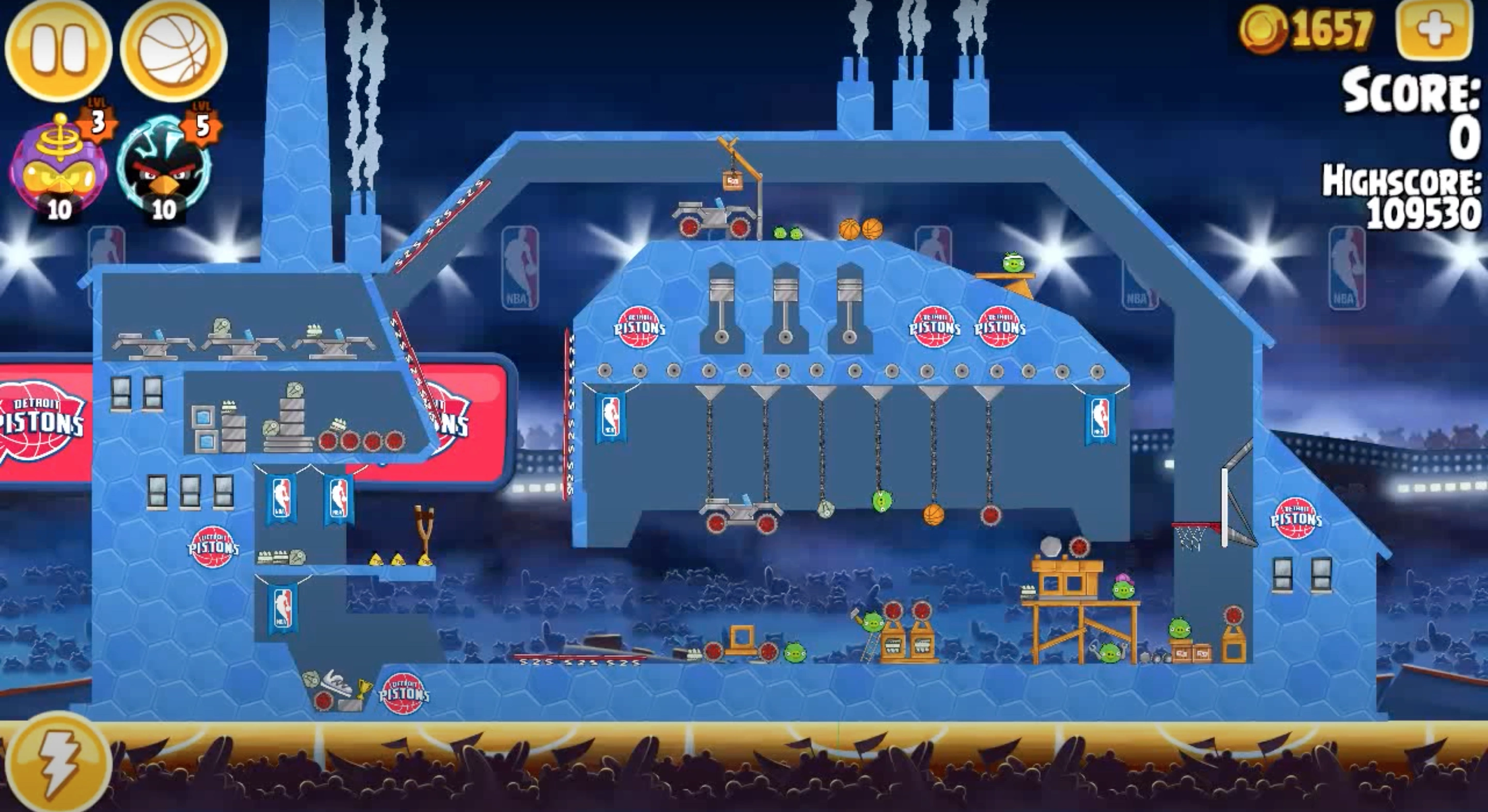 Launch the first Chuck to the TNT to the vehicle can destroy part of the level. Then, Launch the 2nd Chuck to he can destroy all of the chains and you should get 110,000 points.