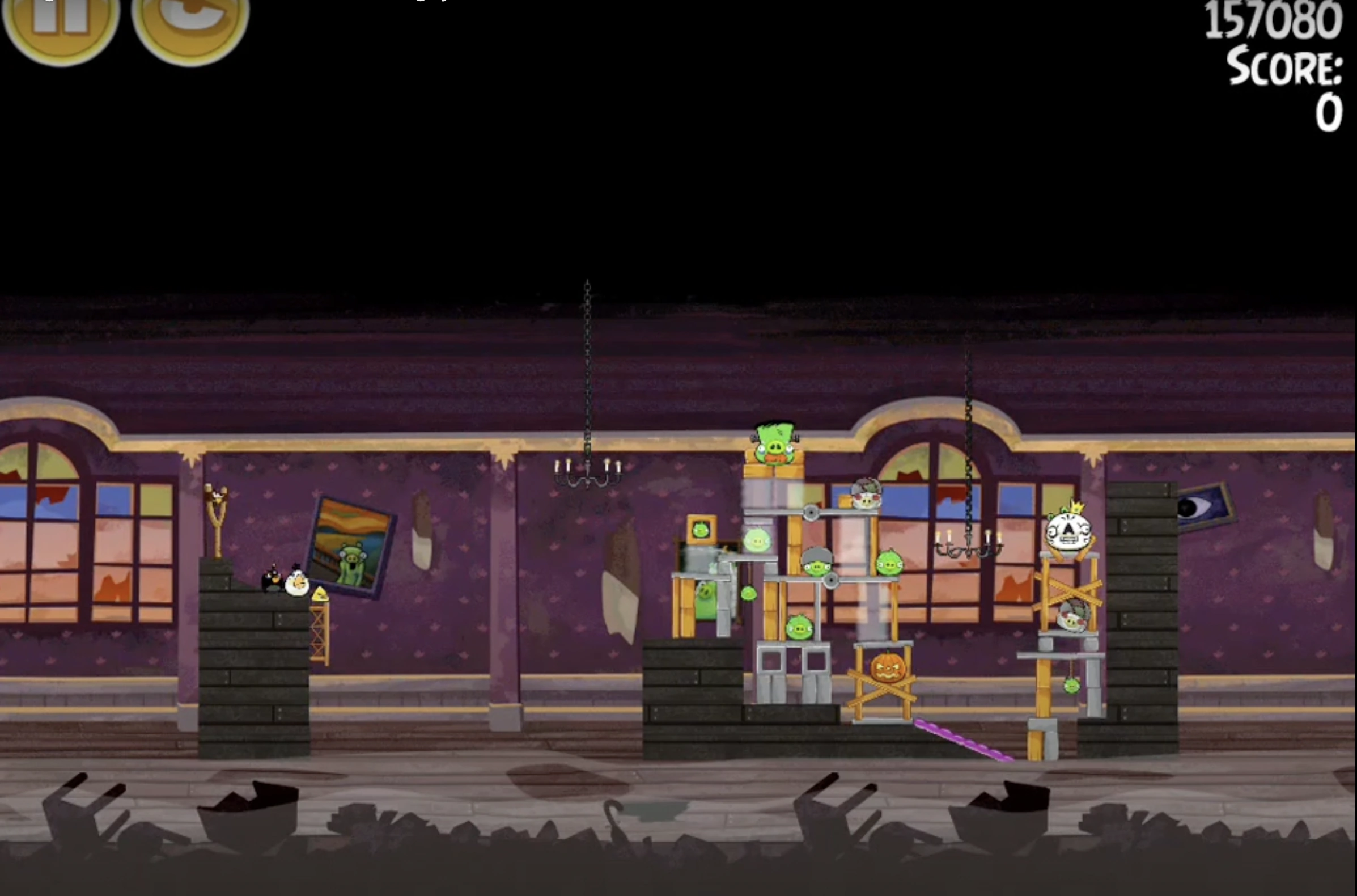 use Bubbles to drop both chandeliers. Throw Bomb into the left side of the main tower, pushing it rightward. Blast the base of the right tower with Matilda to finish the level.