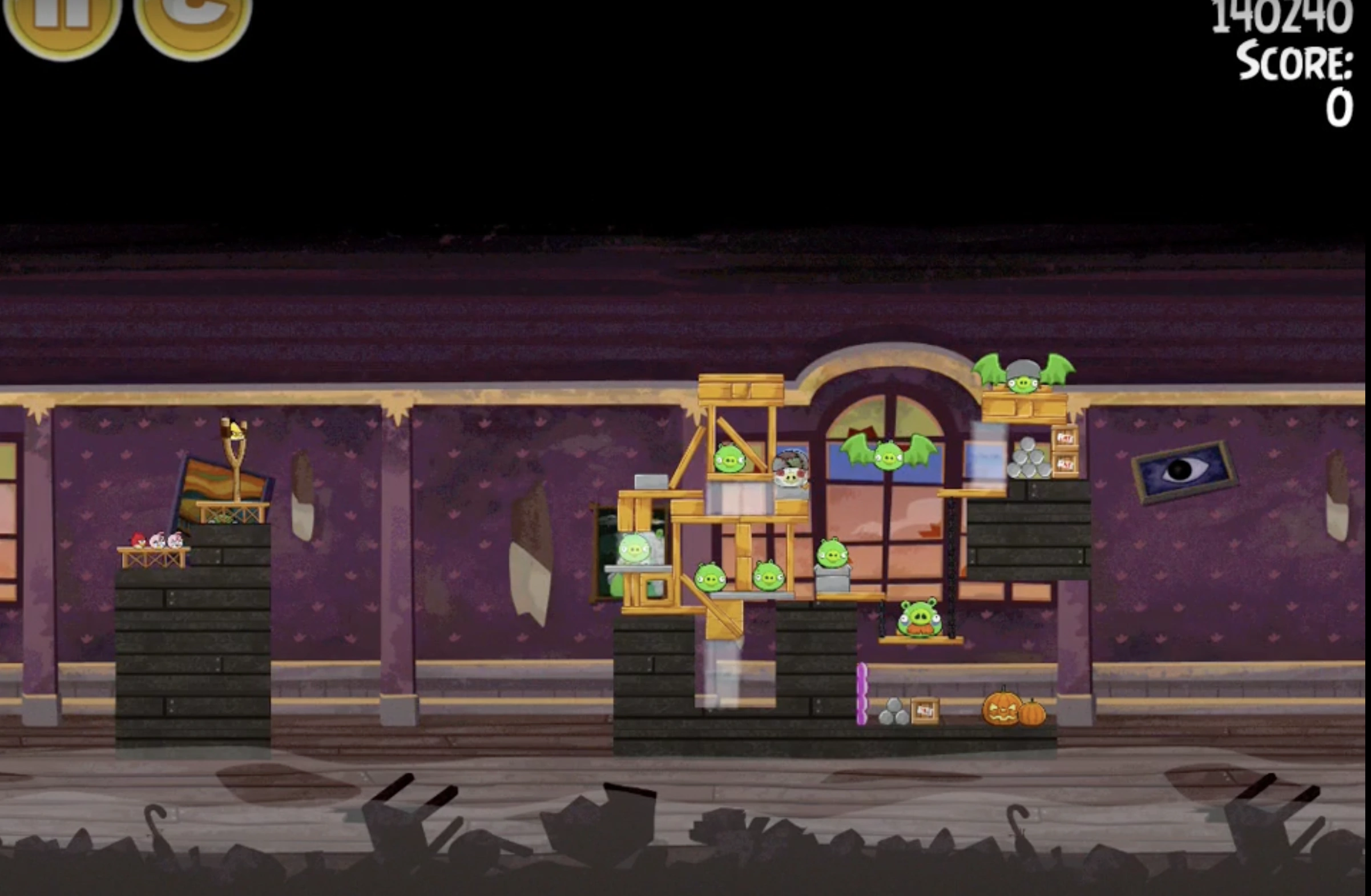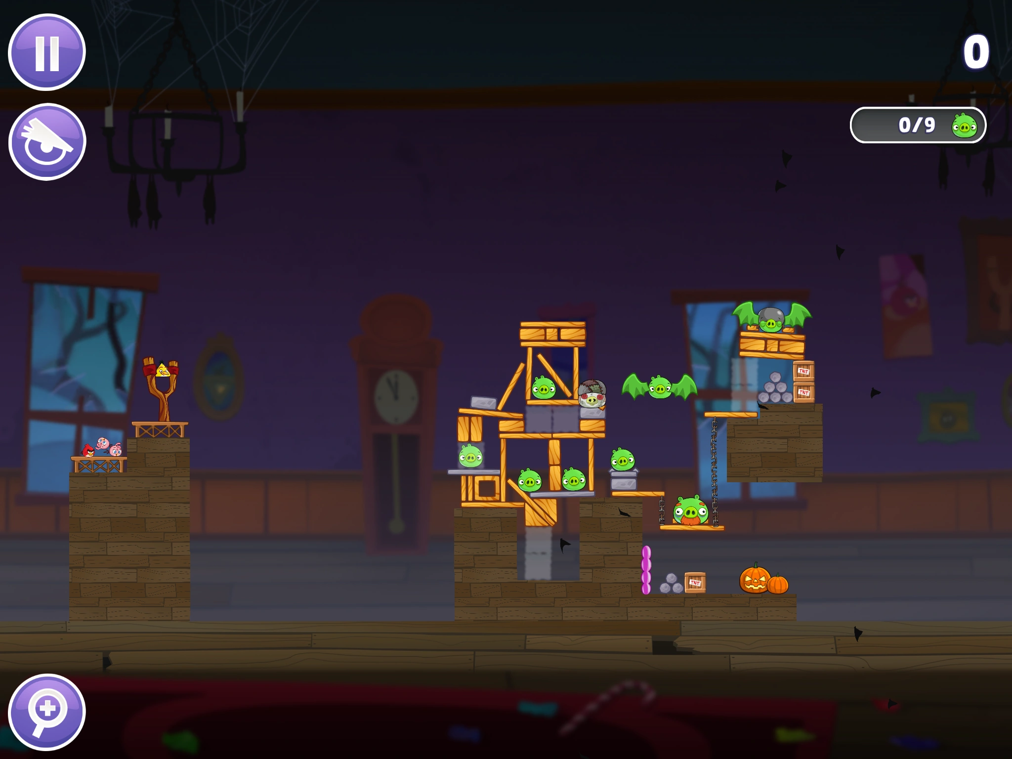 blast Chuck through the leftmost pig and the vertical plank beyond, clearing most of the left side. Fire Stella into the pyramid of pebbles, using the bubbles to detonate the TNT. This should clear the entire level, though you can snipe any pesky pigs with another Stella.