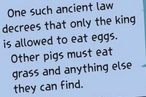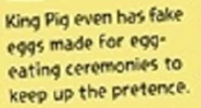 As the only pig who can eat eggs,[1] King Pig is obsessed with the Angry Birds' eggs, which he seeks to eat to legitimize his regime. Due to his minions constantly failing to achieve this goal, he has never tasted an egg, a fact he keeps a secret out of fears of being deposed.[1][19] Despite this, his covetuousness has led him to maintain that eggs are the most delicious meal in the world. To maintain his authority, King Pig frequently arranges "egg-eating ceremonies" with fake eggs made of a mixture of chalk, mud, and grass.[20]