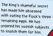 The King makes a brief appearance near the beginning of the story, acting standoffish about the lack of eggs in his possession until a scout informs him about the birds' discovery of a green feather. After soliciting a plan from Chef Pig, The King appoints a "volunteer" to disguise as a bird, sneak into the birds' camp, and steal The Eggs. While he's later mentioned by Hard Head and The Flock, he's never seen physically after this point.