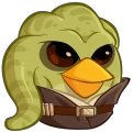 He is a swamp green bird with a light belly, large brown eyes with black pupils, yellow short beak with a large top part and 4 hair tentacles with dark stripes. He wears a white shirt and a brown kimono with a reddish brown belt with a beige buckle and white pendants.