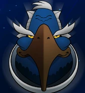 He looks like Space Eagle but dark blue, with a soft beak, white hair, happy expression and wears a white astronaut suit with a black collar. In the game, he doesn't have cheeks.