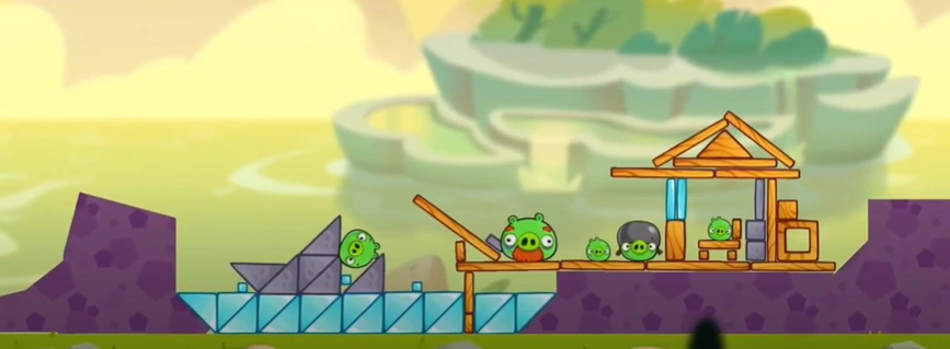 First, fire the Blues flat, splitting through the window of the main structure and popping at least three pigs on the right side. Then, shoot the first Red into the highest stone triangle to pop the leftmost pig, and he will roll into the Foreman Pig. The unused Red and the Blues will award the player an extra 20,000 points.