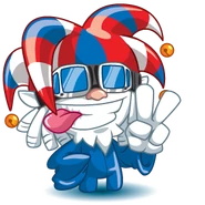 He is a Wiwichu that wears a jester like hat with red, white, and blue stripes and yellow bells. He wears white googles with blues lenses and a blue robe with long sleeves. Lastly, he's covered in white fur with pointy ears and a small beard.