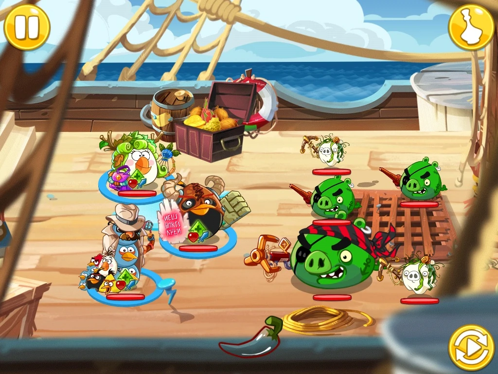 Choose Matilda in Druid, Bomb in Cannoneer(or if you have Berserk, use it!) and The Blues in Spies. Heal with Matilda if the birds' healths are not full and if they're full, attack with her. Then attack with the other birds. Use the Rage Chili for Bomb if there are more than a pig or for The Blues if there are only a pig on the battlefield and for Matilda if a bird's health is under 80% when the Rage Chili is full! Also, kill the Matey pigs first, then the Pirate Veteran and then the Ship's Kobold. Repeat this over until you win or either lose.