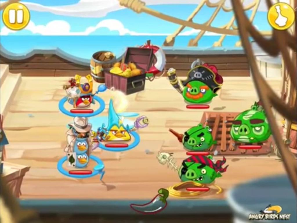 Choose Red in Samurai, Chuck in Lightning Bird and Matilda in Druid. Heal with Matilda if the birds' healths are not full and if they're full, attack with her. Then attack with the other birds. Use the Rage Chili for Chuck if there is more than a pig remaining or for Red if there are only a pig on the battlefield and for Matilda if a bird's health is under 80% when the Rage Chili is full! Repeat this over until you win or either lose.