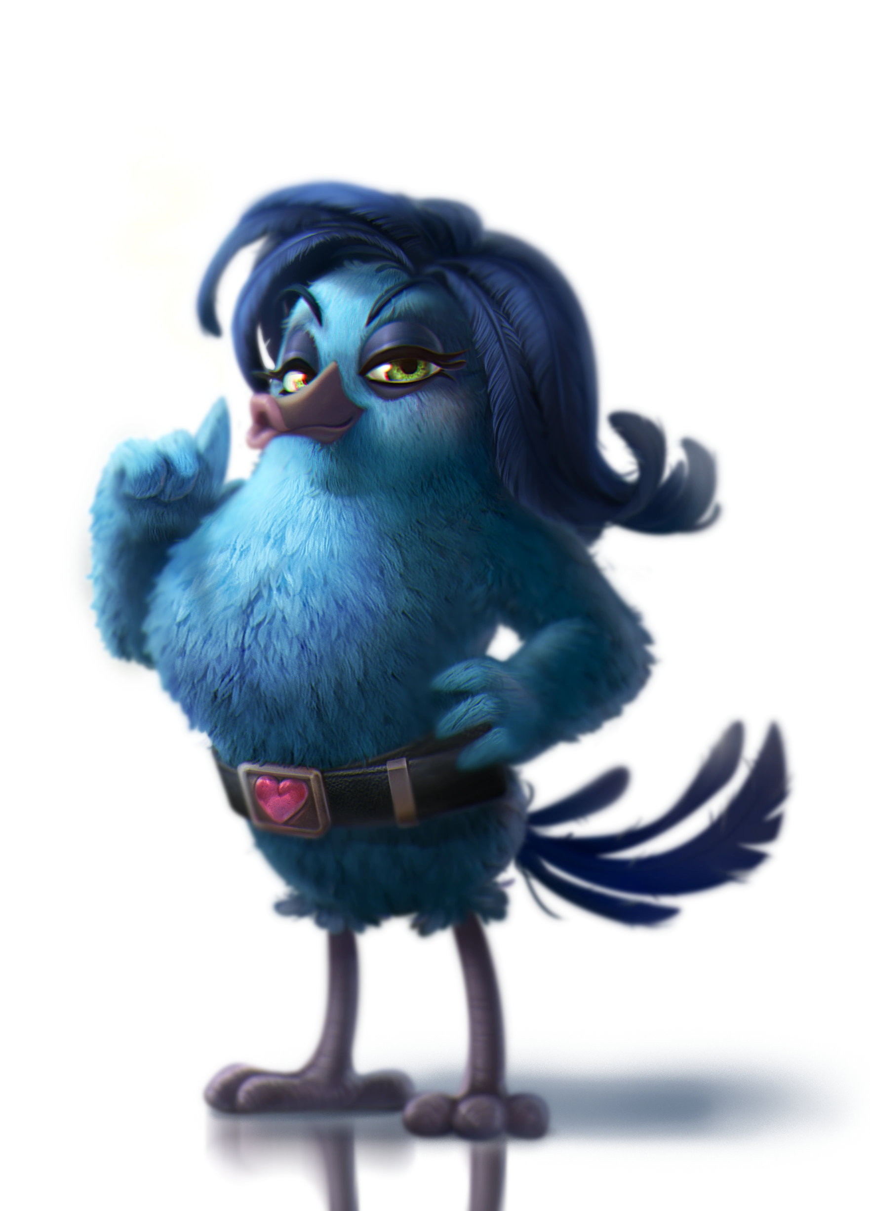 She is a tall bird with a flat head, a pronounced chest, a long blue wings, a gray-purple legs, a long gray-purple beak with the upper part slightly extended upwards, a light green eyes with violet eyelids and noticeable black eyelashes, a dark blue and thin eyebrows, a dark blue hair that is long and curly at the end.