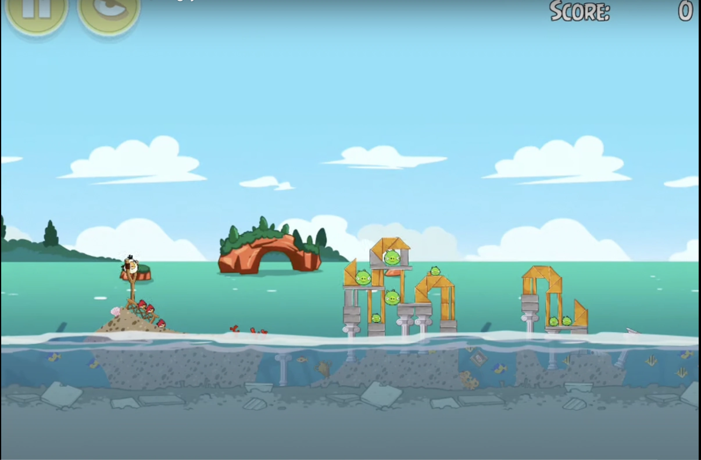 fire Matilda straight ahead (a bit low) and drop the egg bomb at the last minute so that the bird ricochets up just a bit. The impact and the egg bomb should destroy the entire left side and may even take out everything. If needed, fire a Red up and over to pop the pigs on the far right.