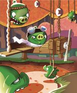 In Angry Birds Action!, they may briefly appear after a player takes a turn, dropping blocks or TNT crates, but they are untargetable, on the Bird Island portion they dress themselves as birds and their planes are made of natural resources such as bamboo and leaves.