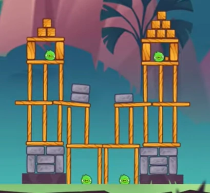 Shoot Red at the base of the first wooden tower at the Stone blocks to upset the balance. Then shoot Matilda's egg between the two towers at the lowest point so that they collapse on each other causing colossal damage and killing all pigs. Chuck, who is unused, awards the player 10,000 extra points.