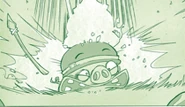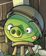 He bares a resemblance to Corporal Pig, with a matching helmet. However, his eyes are visible, similarly to the old toons design and classic sprites for the helmet pigs. The story describes him as being more pale and more out of shape than the average pig, but the artwork does not reflect this description.
