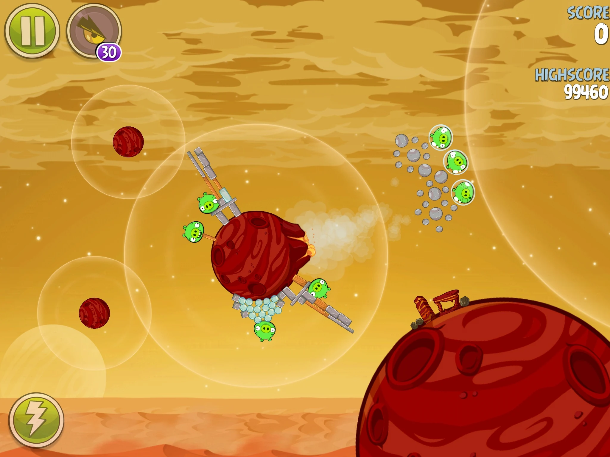 Launch Lazer Bird towards the lower small planet. The gravity field should pull the bird upwards and redirect him towards the bottom structure of the larger planet. Aim for the pig sitting on the stone platform. Debris should collapse on the geyser, sending them towards the bubble pigs above. Finally, launch ice bird directly onto the top structure to destroy the remaining pigs.