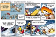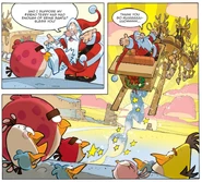 Santa himself physically appears by the end of the story, battling the pigs at home with a slingshot. He tells The Flock that he has been hiding in Piggy Island to relive the stress of delivering presents. Santa gets angry at the pigs, and then bids goodbye to the Flock.