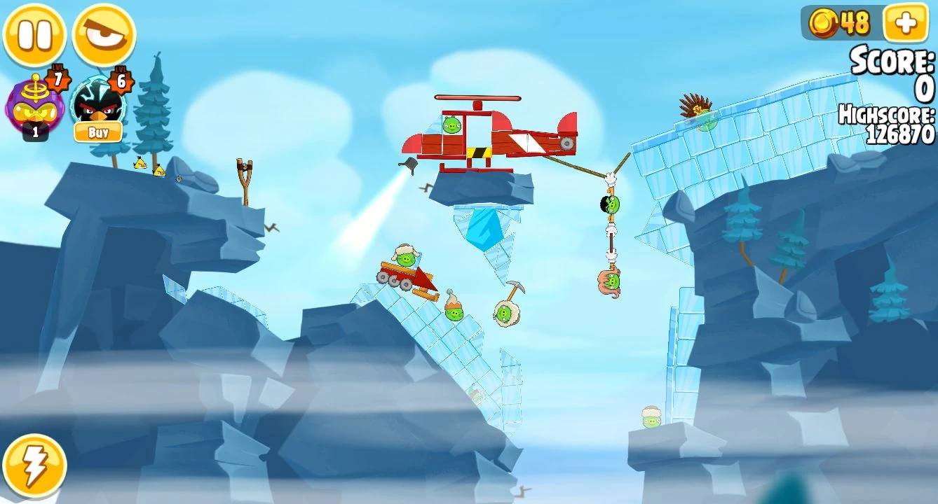 Launch the blues at the propellor of the helicopter, multiplying them around halfway in their trajectory so that the frozen pig is killed along with those in the middle and bottom right. Next, launch the other blues at the hanging boulder so the rest are killed.