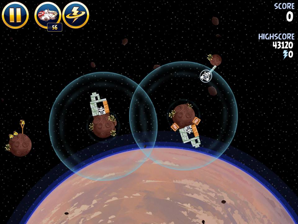 Send Han Solo on the edge of the southern hemisphere of the first planet. He will fly up through the northern hemisphere of the second planet, with the help of the gravitational pull. While inflight, just above the second planet, shoot your Blaster at the far left pig-trooper. The shots should ricochet on the iron blocks and head towards the bubbled pig. Meanwhile, Han should continue his flight towards the TNT crate, destroying the pig below.