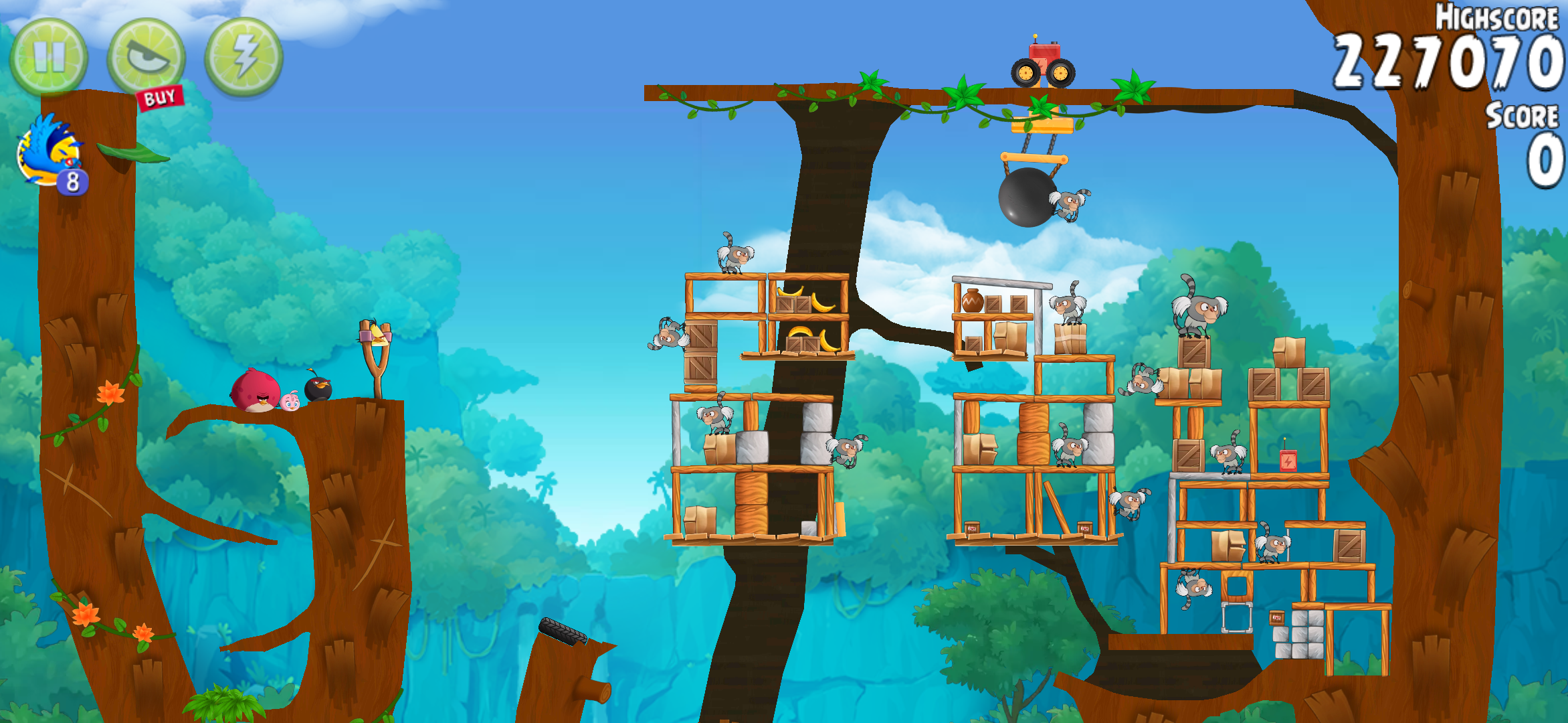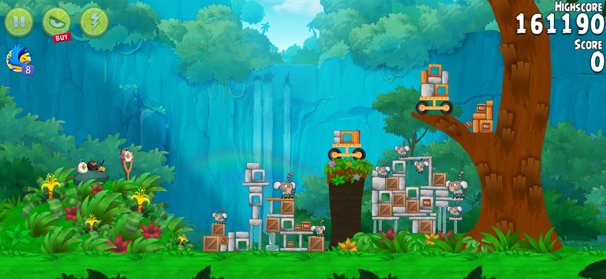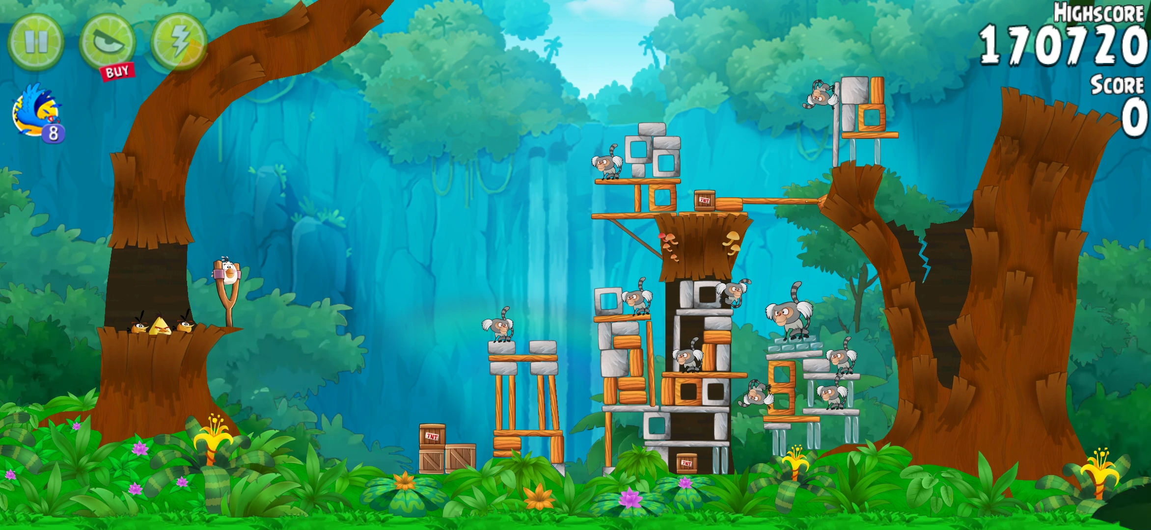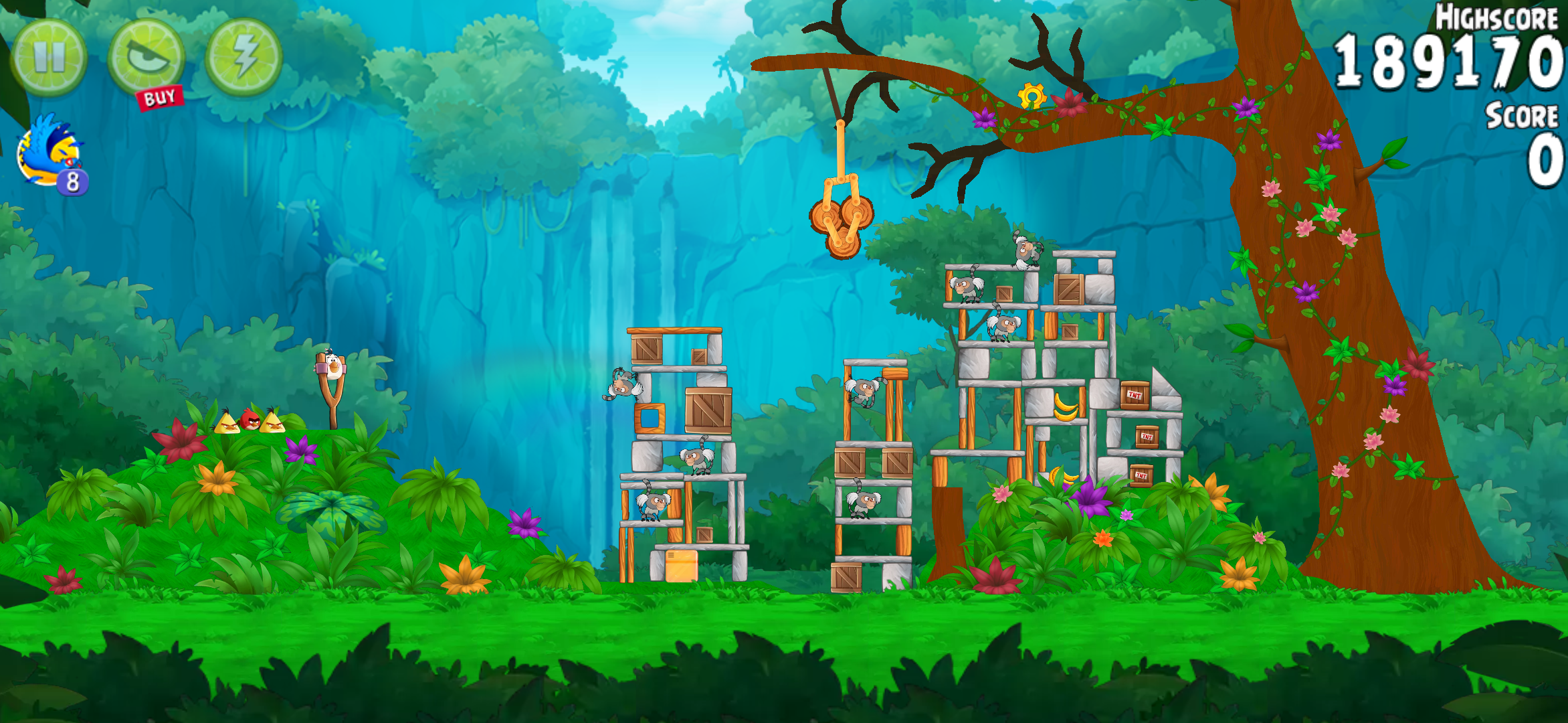 1 | 100,000 | The player should launch Blu just above the second marmoset. | The player should repeat the tips on the left, then use the Mighty Eagle to destroy the palmtrees behind the slingshot and some rubble. |