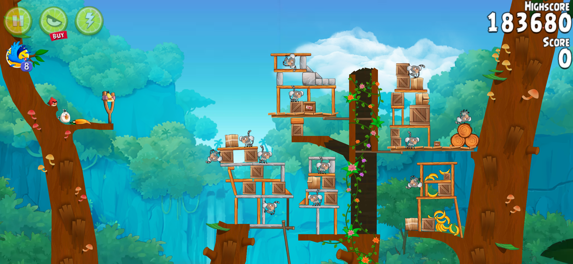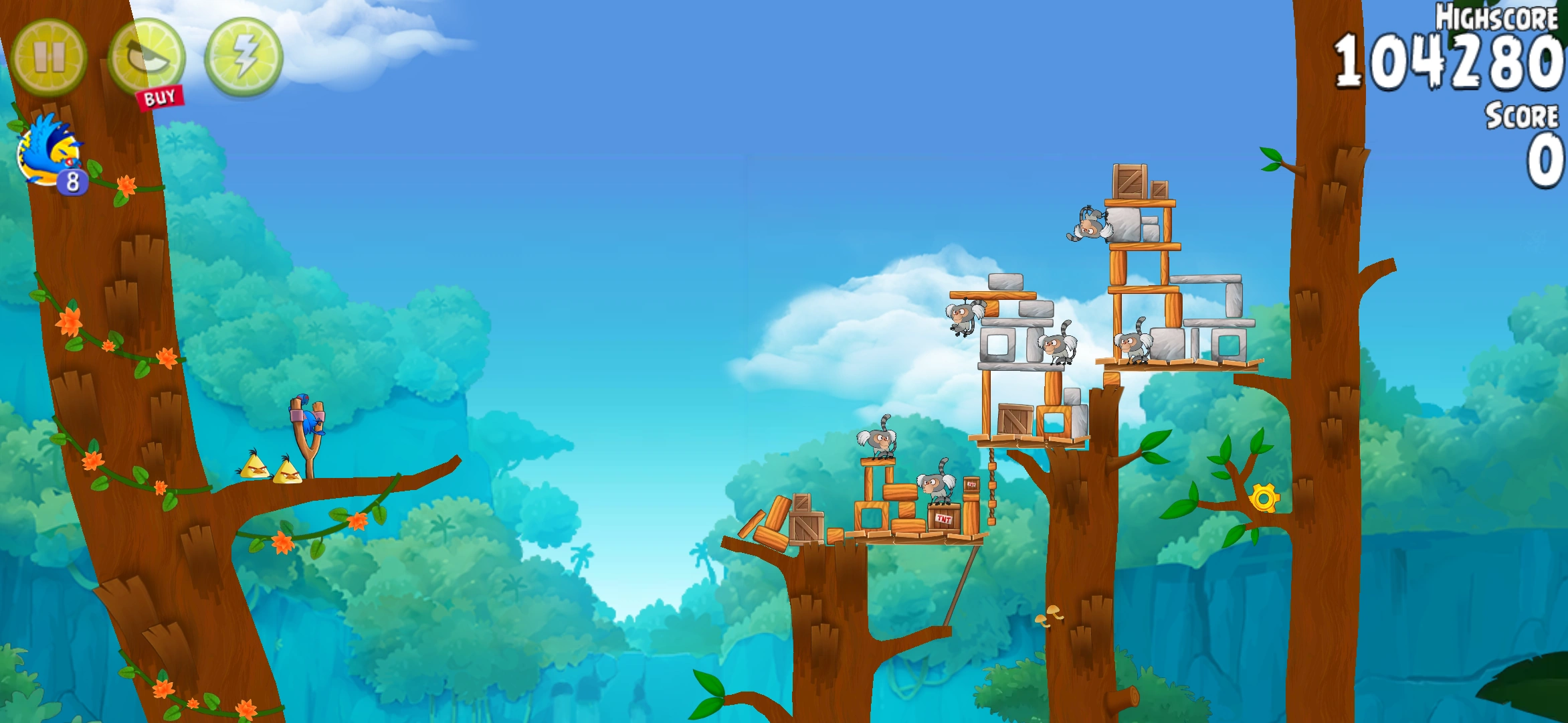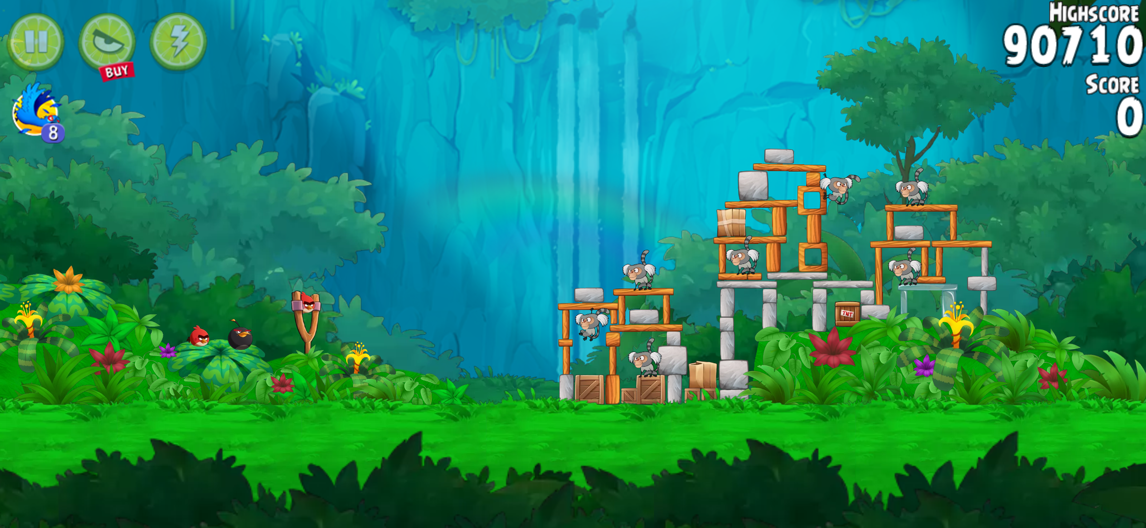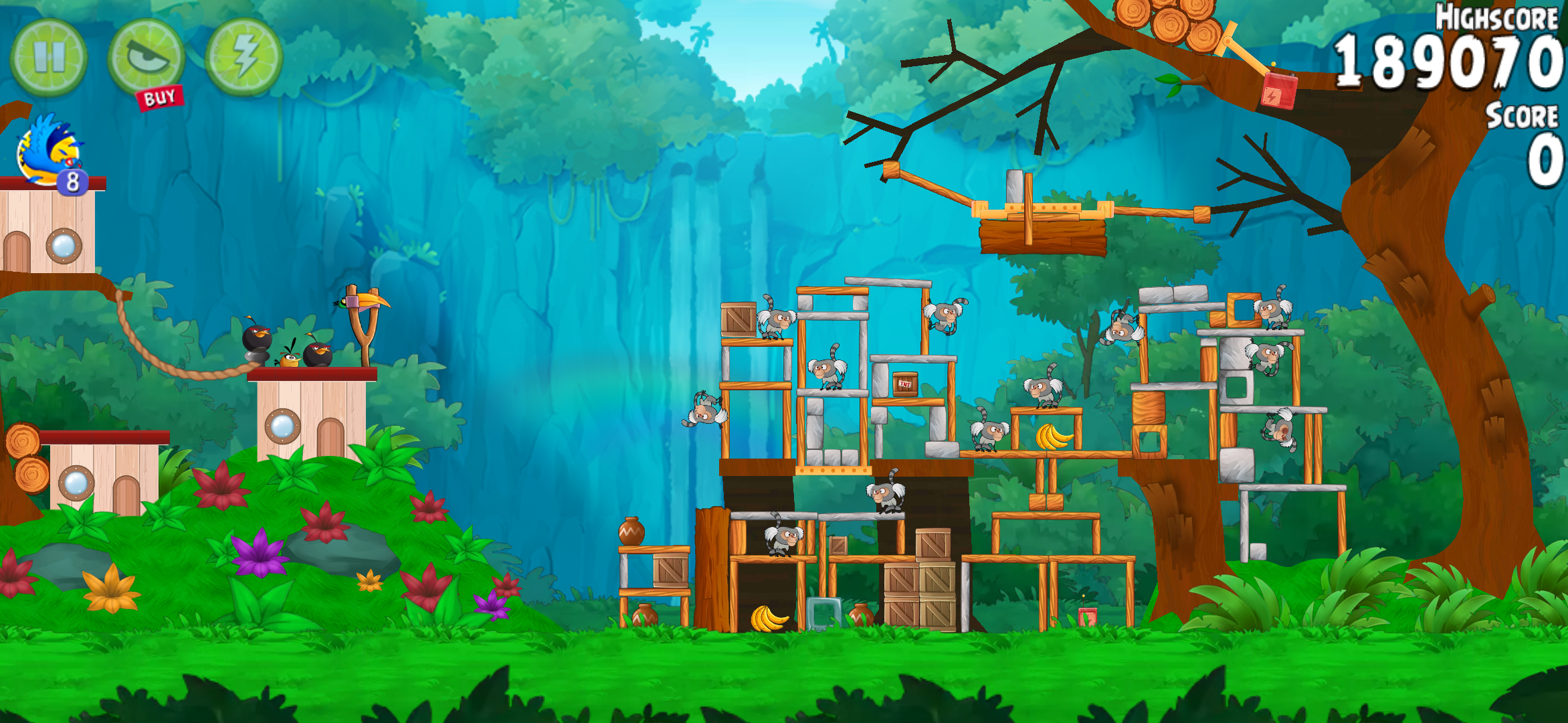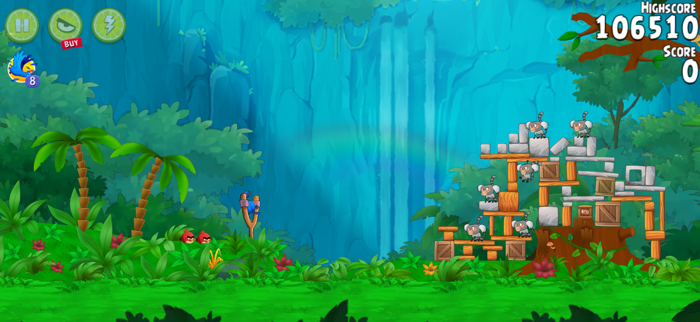 1 | 100,000 | The player should launch Blu just above the second marmoset. | The player should repeat the tips on the left, then use the Mighty Eagle to destroy the palmtrees behind the slingshot and some rubble. |