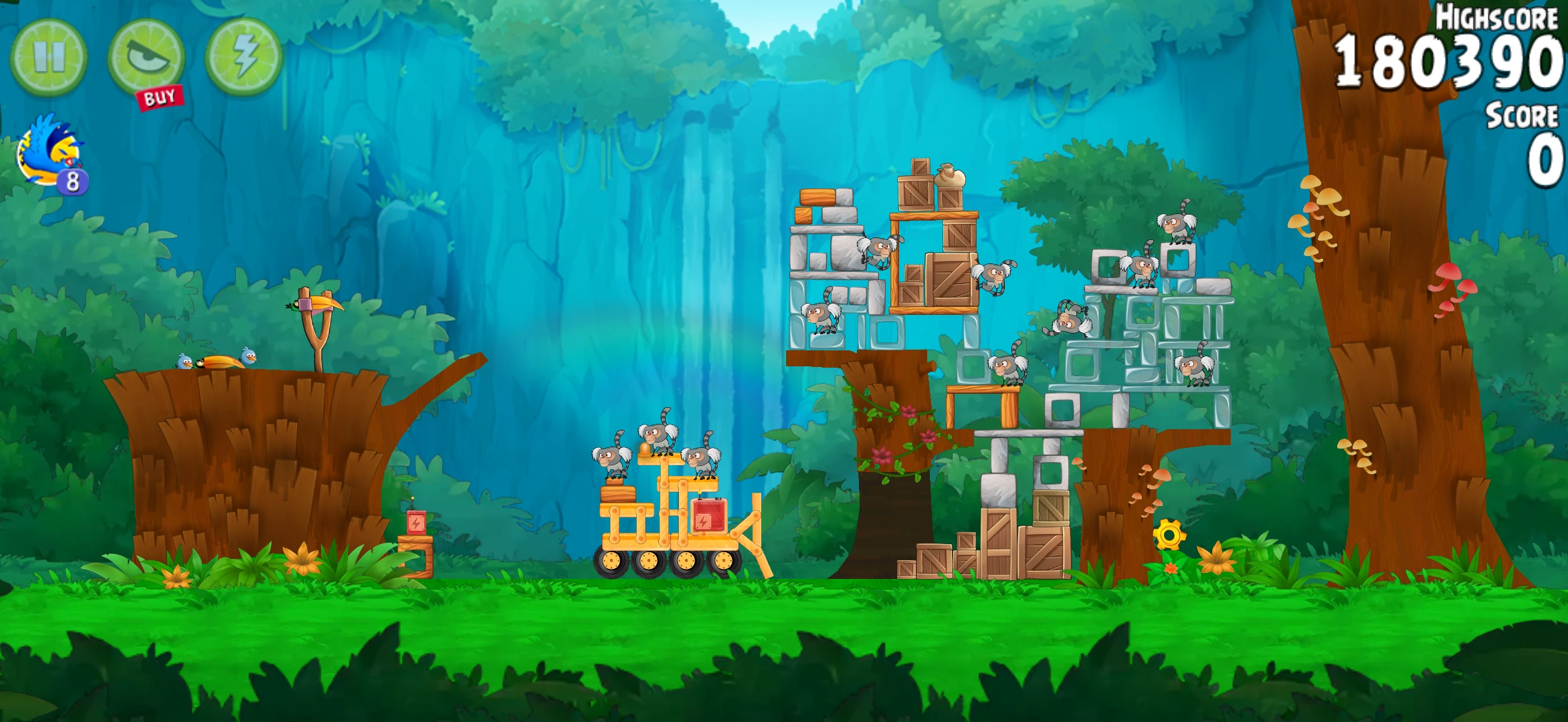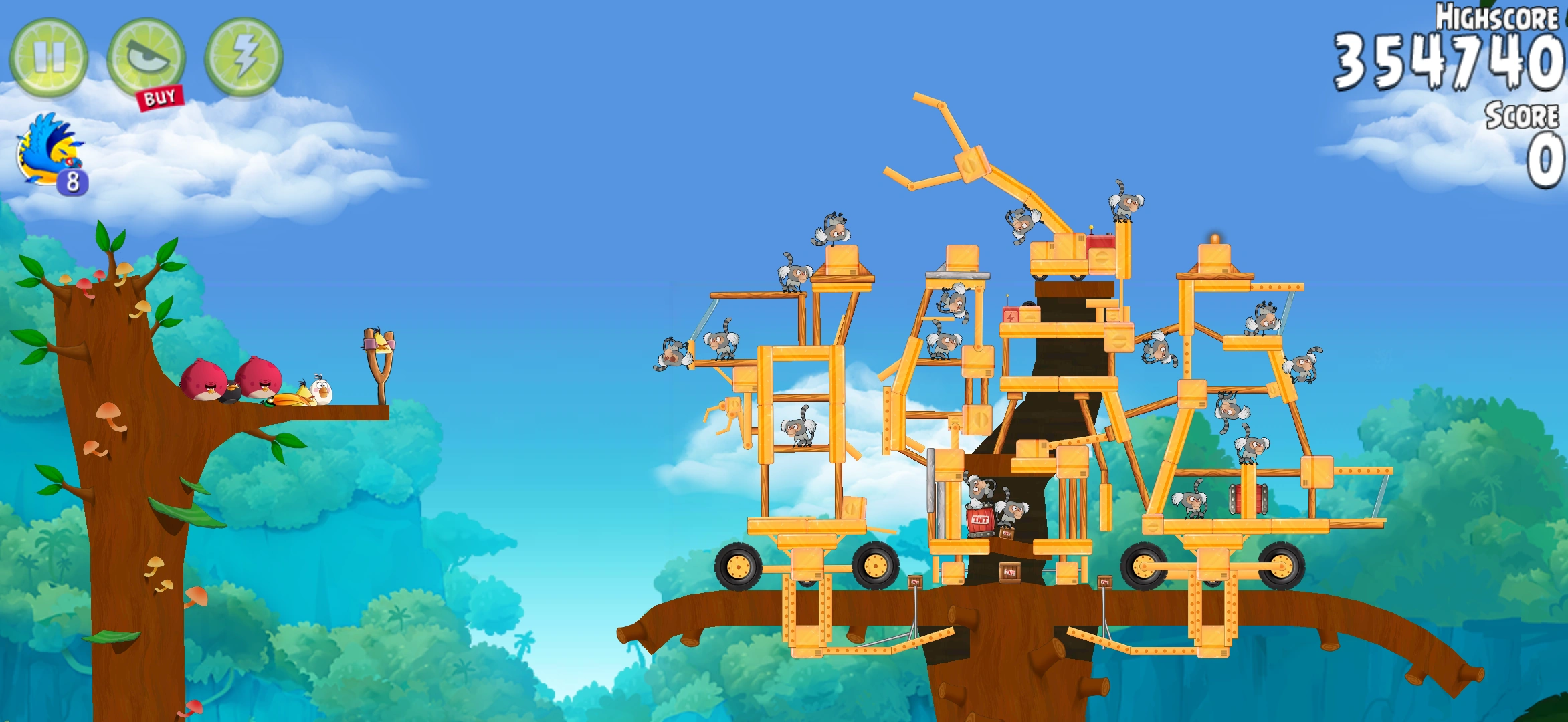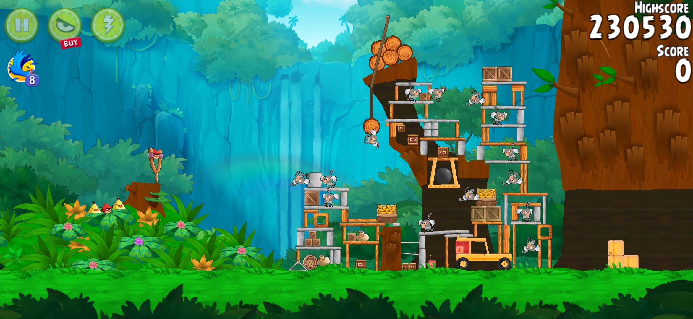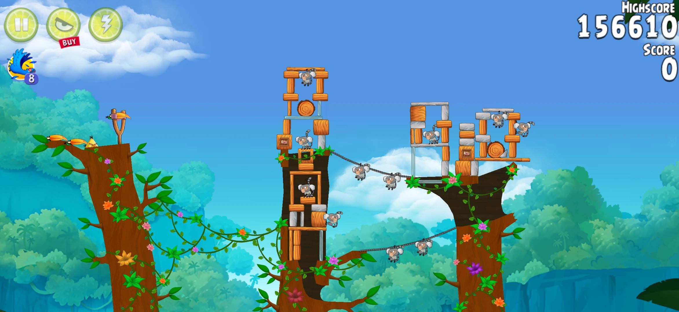 1 | 100,000 | The player should launch Blu just above the second marmoset. | The player should repeat the tips on the left, then use the Mighty Eagle to destroy the palmtrees behind the slingshot and some rubble. |