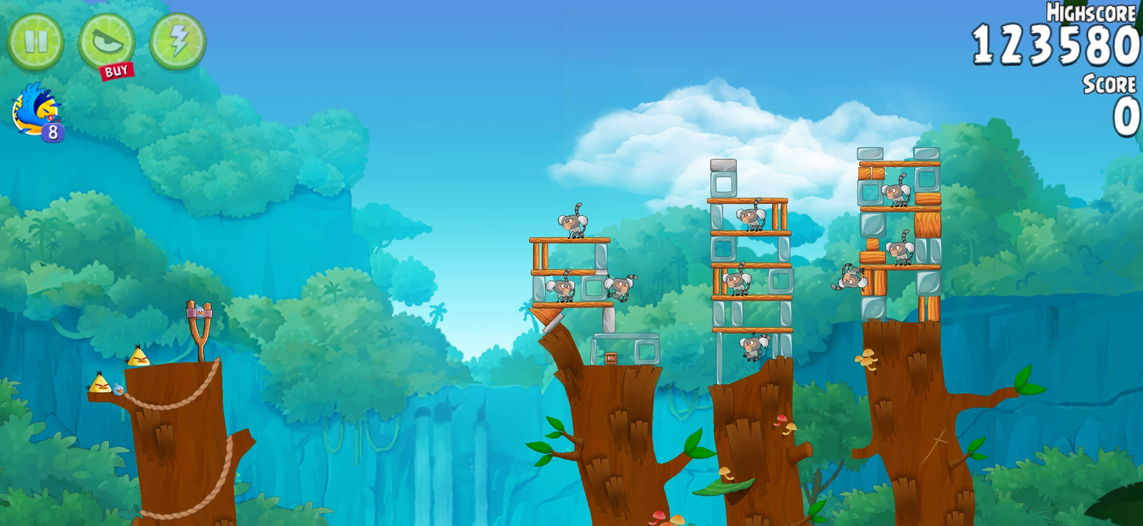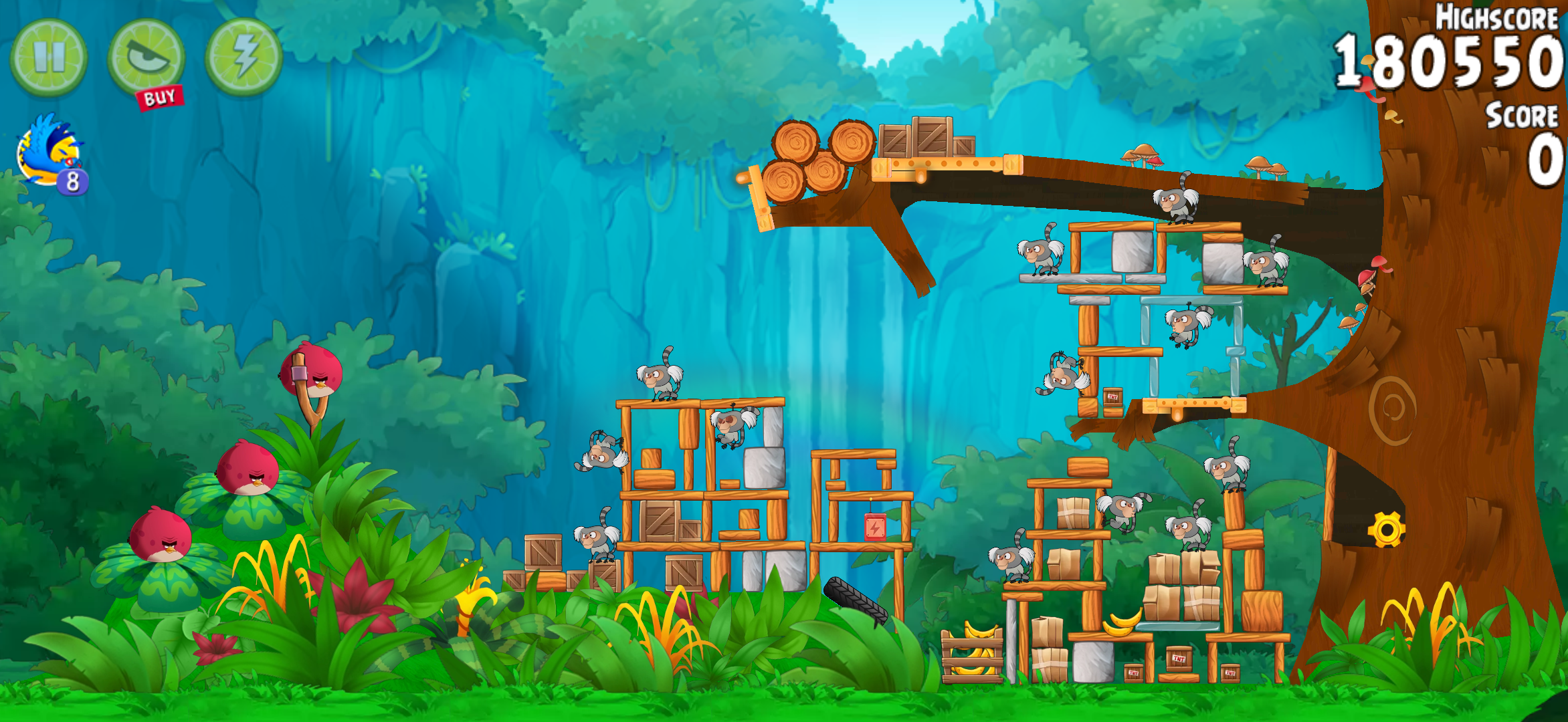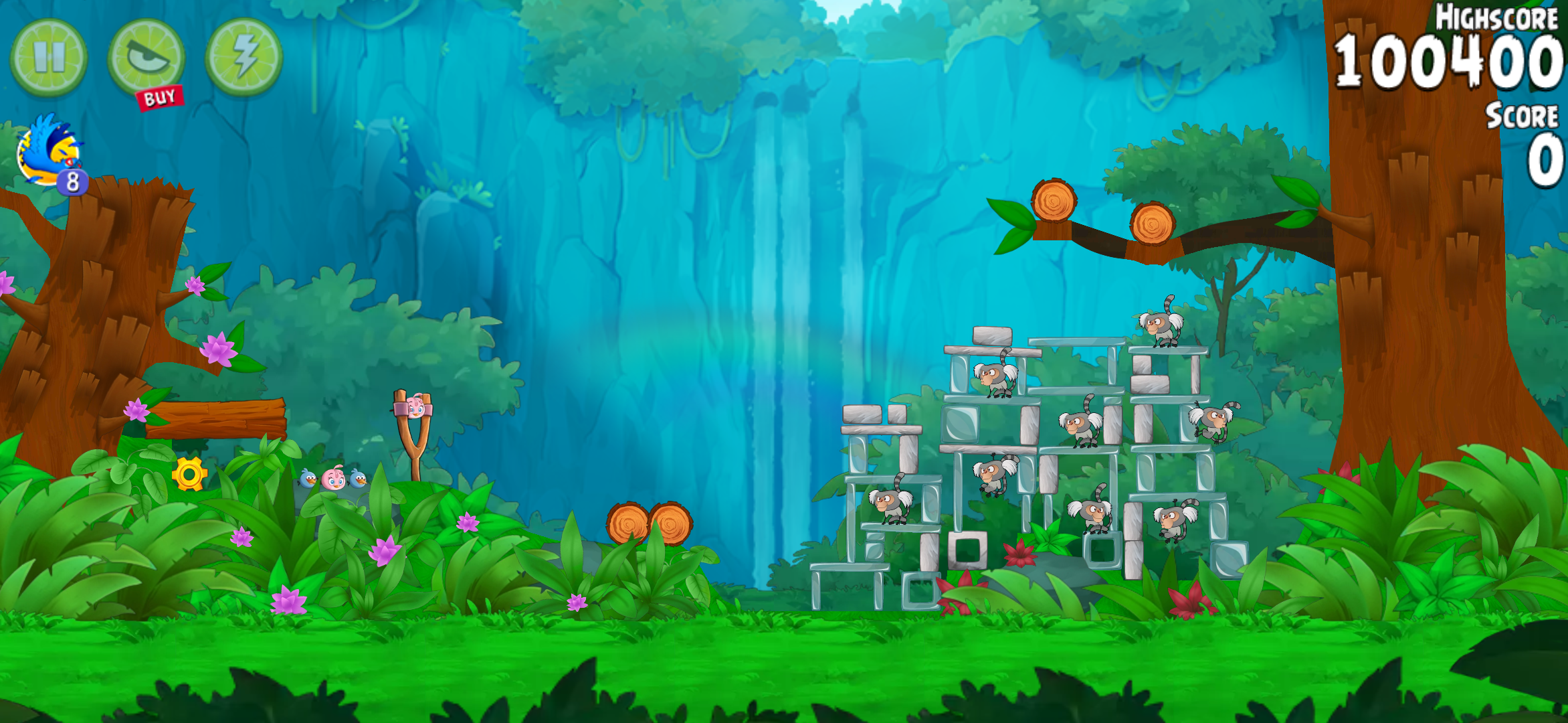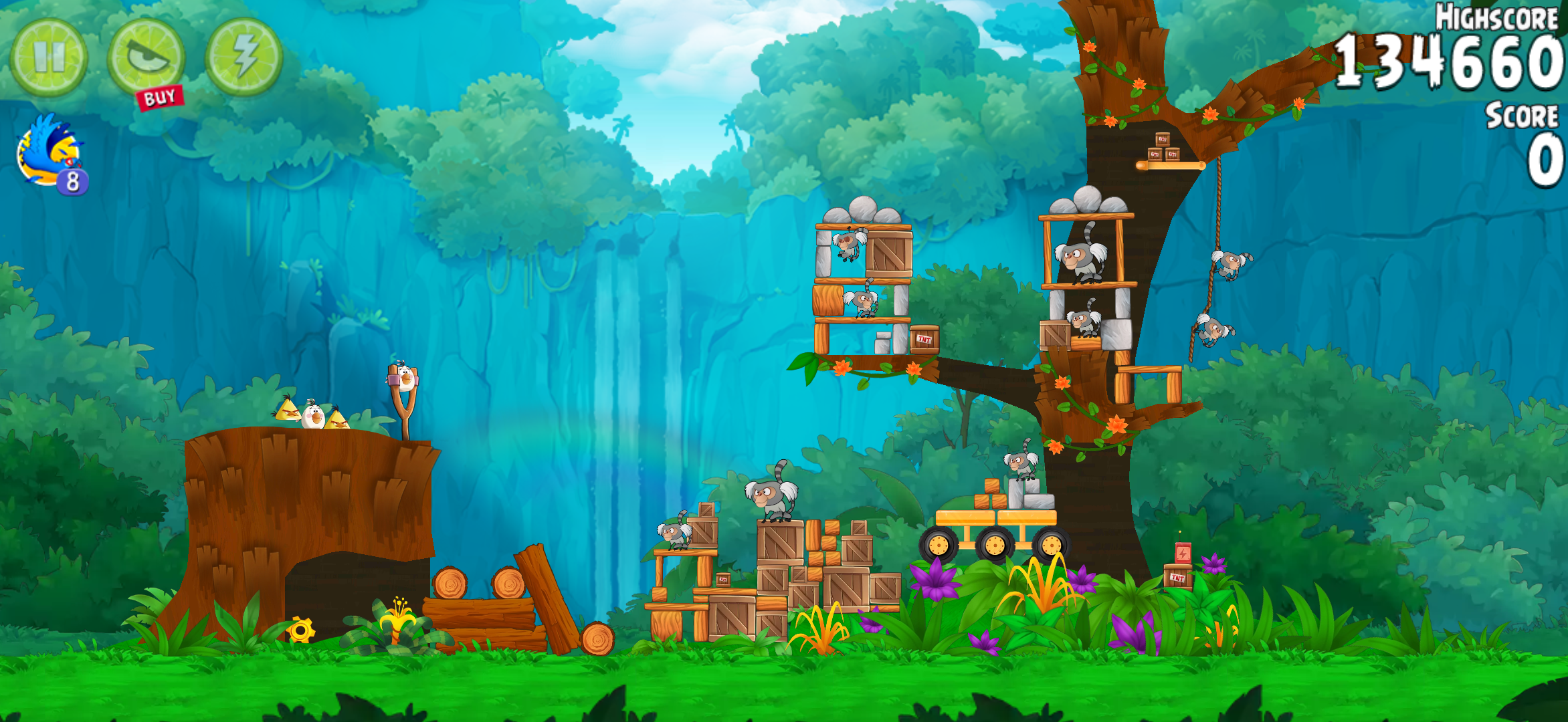 6 | 100,000 | Stella should be thrown to the gap between the two elevated logs, using her ability to take each of them with her bubbles to hit the support beams on each side of the main structure. This will leave an open clearing for the Blues to strike at the heart of the building. | After repeating the 3-star recommendations, the player should use the remaining birds to clear as much rubble as possible, then rest the sardines onto the log behind the slingshot. |
