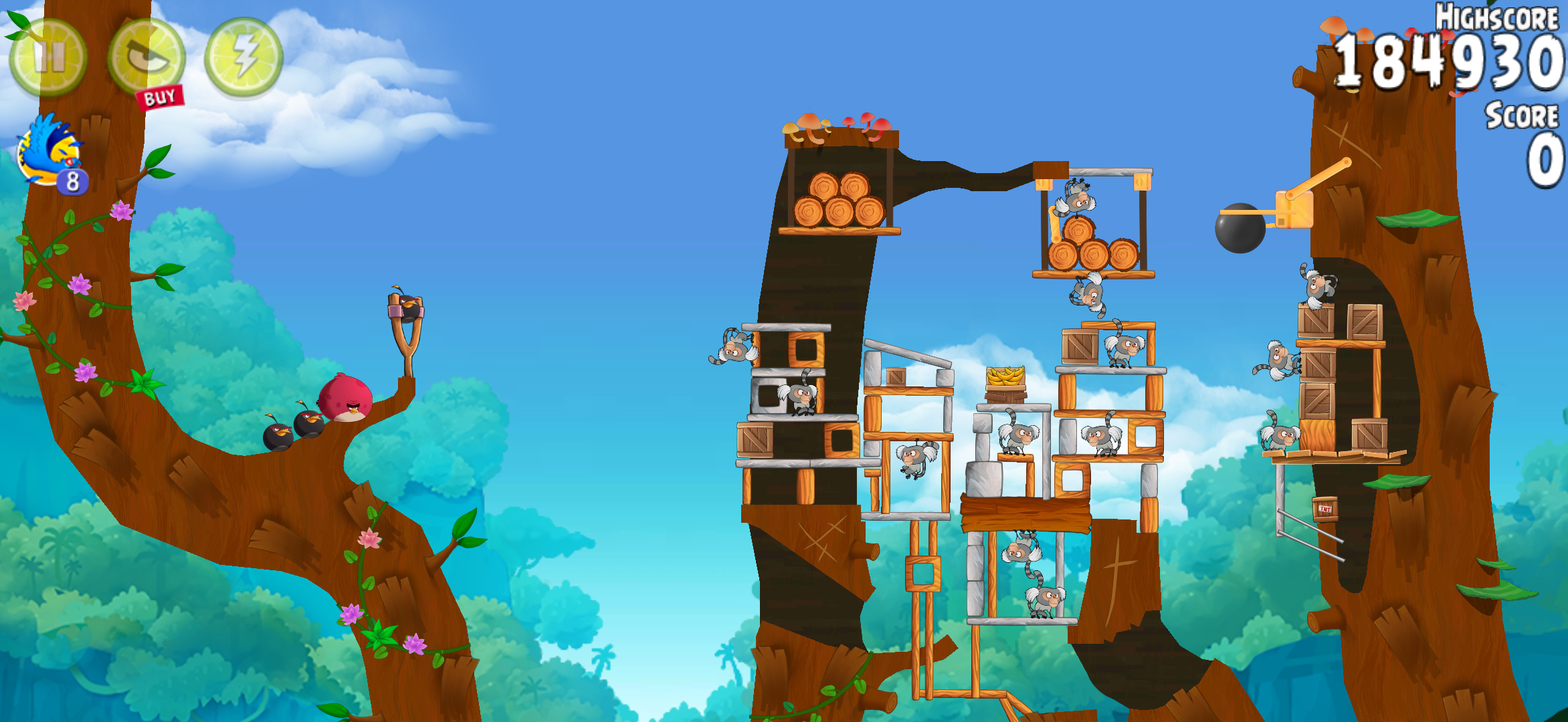 17 | 174,000 | The first Terence should be launched in an upward angle so he rolls into the structures at the right, destroying them both. The second Terence should then be thrown towards the angled "branch" in the middle of the level so he triggers the switch to take down the remaining marmosets. | The sardine can should be launched into the debris of the leftmost structure after the player follows the recommendations on the left. |