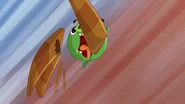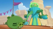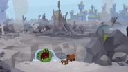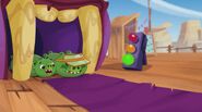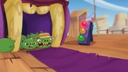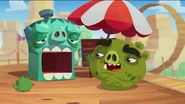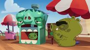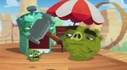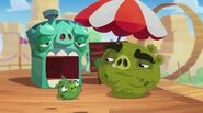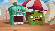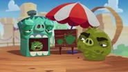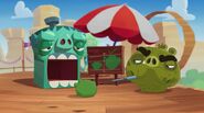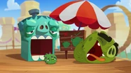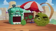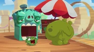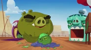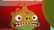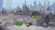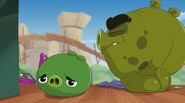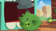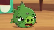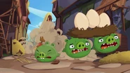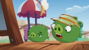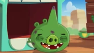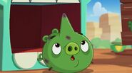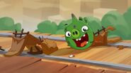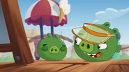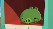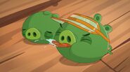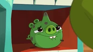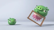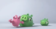 When Bomb crashed into the Pig's ship bunker after using the Trampoline, he lands in a room filled with nothing but Minion Pigs, including what seems to be Tiny Minion Pig, who tells the bird trio that they were hiding. He (or a Photog/Ross-like pig) is possibly the pig that waves and says "how're you doing" to Stella. He is also seen with Monty Pig wearing a helmet and he is seen guarding the eggs.