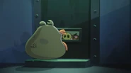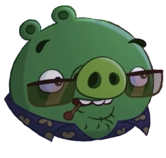 He is standard Minion Pig that wear purple shirt with yellow hearts, brown sunglasses and a match in his mouth, as he work for the Pig City toy seller department.