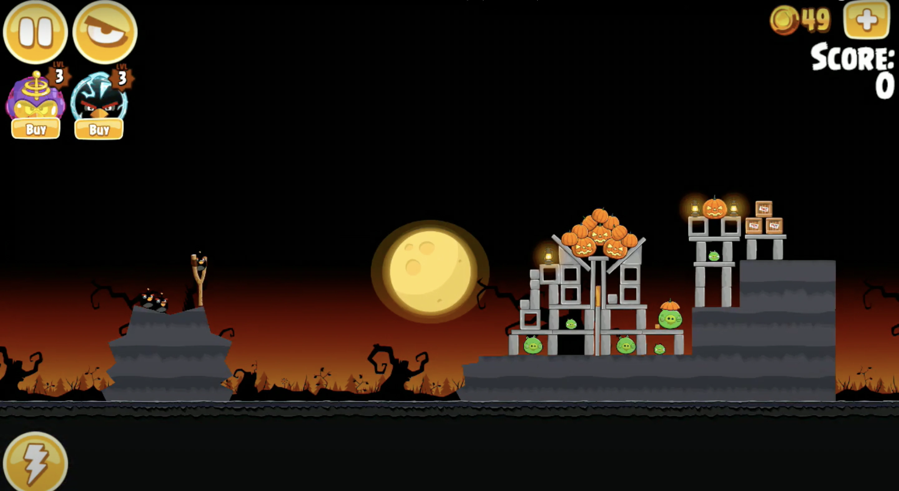 Launch the first Bomb over the tower of pumpkins and into the base of the farthest right tower. Trigger the explosion manually as soon as he hits the leg of the tower. Fire the second Bomb at the bottom left corner of the main structure and then detonate once Bomb is under it. Fling the third and final Bomb into the center of the structure to take out the remaining pigs.