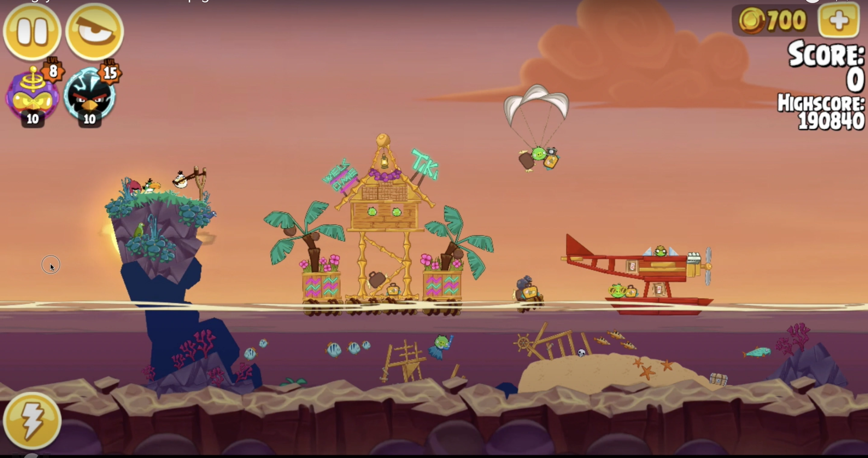 Launch Matilda and then drop her egg onto the bottom right palm tree and she will destroy the parachute and the giant raft can collapse and she should land on and destroy the red plane and you should get over 176,000 points