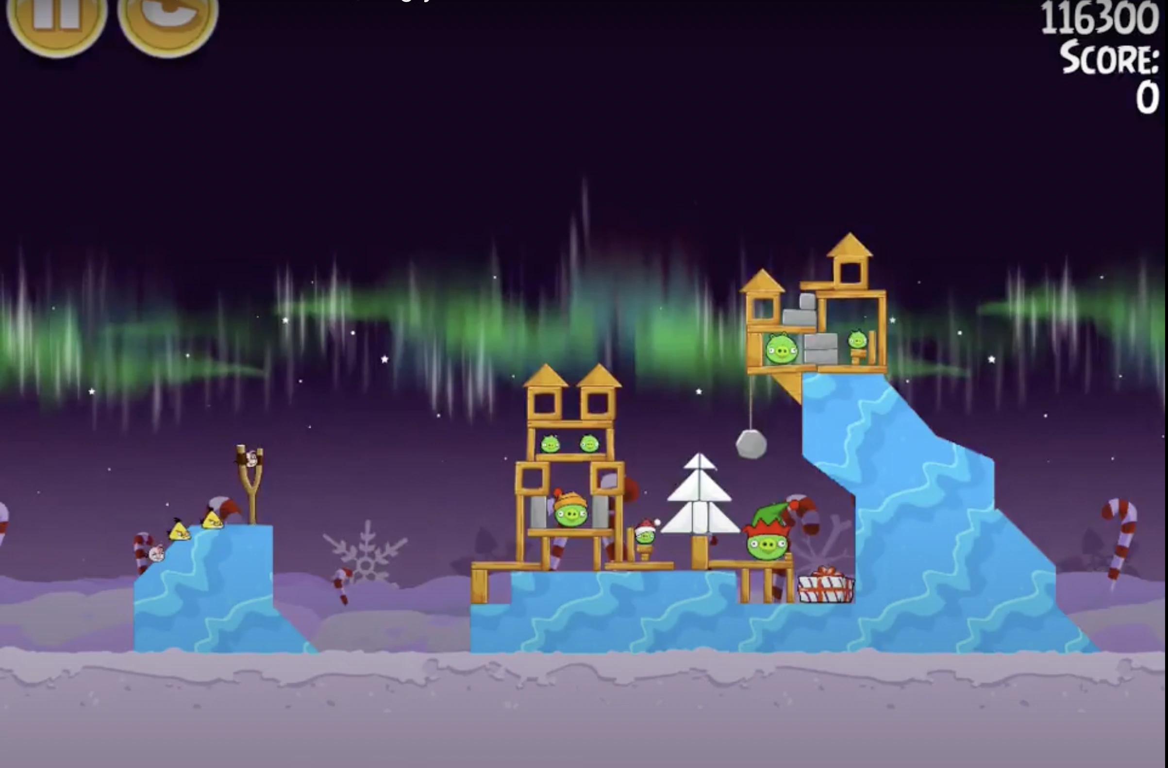 Alternatively, fire Stella straight ahead into the left structure, just above the hollow wooden square. This can cause the entire structure to slip on the ice, falling to the ground. Finish by blasting the triangle in the corner of the top-right structure.